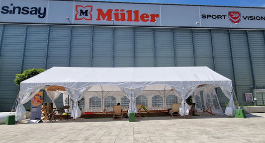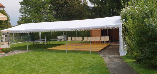V šotor lahko postavite klopi, mize, oder, plesišče. Lahko jih sestavljate. Kar pomeni, da lahko ustvarite prizorišče z več šotori ali celo en velik megašotor.
